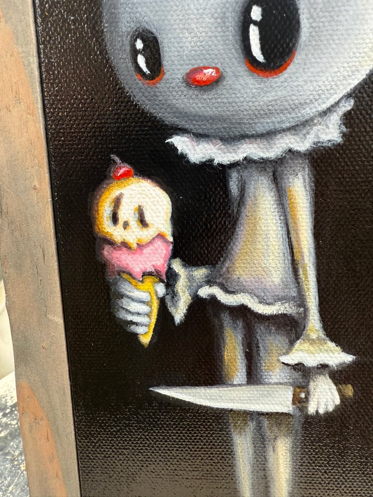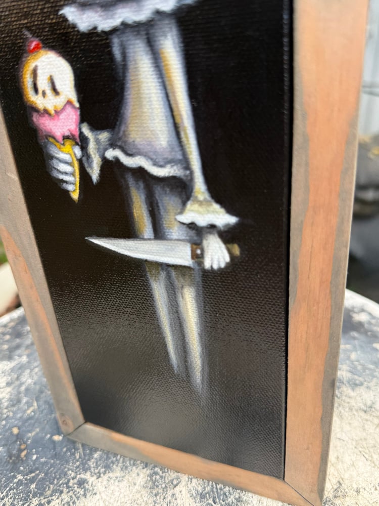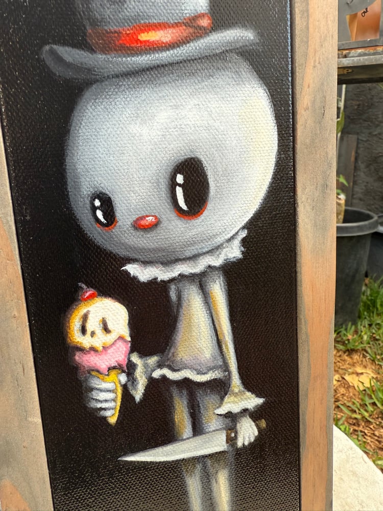 Original Title: “A Treat Before the End” Artist: Oscar “Sketch” Navarro Medium: Acrylic on canvas Size: 4in x 12in Signed by artist on the back of canvas.